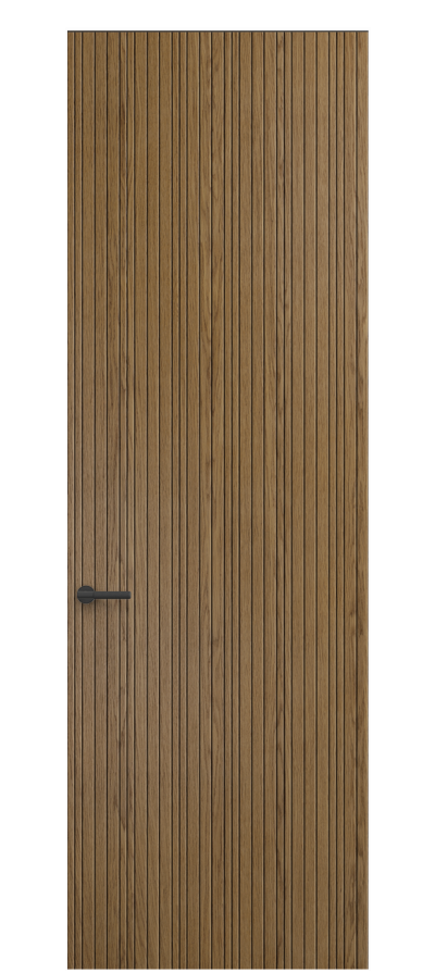 SELECT — коллекция минималистичных дверей с фрезеровкой по натуральному шпону. Рельеф на поверхности полотна создаёт игру света и тени, добавляя пространству динамичности и визуального объёма. Двери SELECT в сочетании со стеновыми панелями и мебельными фасадами, повторяющими лаконичный дизайн, создают единое стилевое решение.